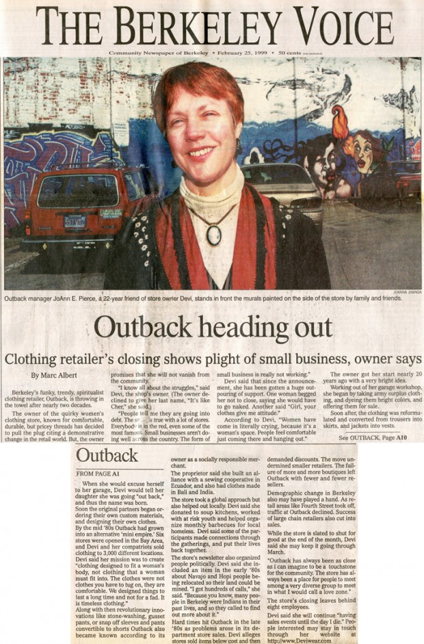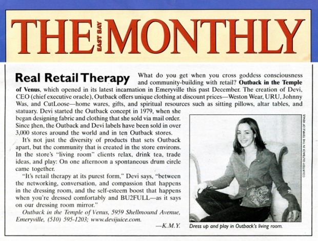 Devi’s motto is “Be Fearless, Choose Love”. Outback and Devi labels represented clothing with a message – a compassionate focus on ecology, social justice, and materials. Clothing lines were integrated around themes on colorful hangtags like “The Spirit of America” and “Save the Rainforest. (See Devi’s clothing hang tags.)